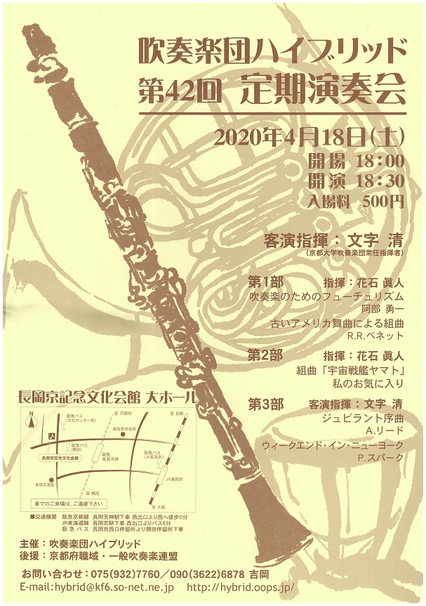 『 第42回定期演奏会 』 のお知らせ 新型コロナウイルス感染症拡大防止のため中止といたします。 日時: 2020年 4月18日(土) 18:00 開場、18:30 開演 長岡京記念文化会館 大ホール にて開催予定でした。 第42回定期演奏会につきましては、この度の新型コロナウイルス感染症 の拡大防止のために中止といたします。 出来ることであれば団員一同、 開催を目指したかったのですが、この状況下ではご来場いただく皆さまの 安全を確保することが困難であるため、健康と安全を考慮し苦渋の選択と なりました。 いつもご声援くださり演奏を楽しみにされている皆さまには、 ハイブリッドの魅力と創る音楽を聴いていただく機会がひとつ減ってしまう こと誠に申し訳ございませんが、どうか事情をご理解賜りますようお願い 申しあげます。 なお活動を再開いたします際には、団員全員が一丸とな って気持ちを新たに、さらなるパフォーマンスを発揮できるように練習に 努めてまいりますので、どうか熱いご声援をよろしくお願い申しあげます。 今後のことは、このお知らせページ および ブログ にてお知らせいたします。